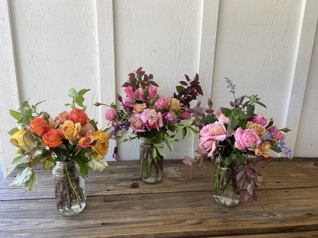 Fresh vase arrangements of beautiful rose blossoms, greenery and filter accents in two sizes.